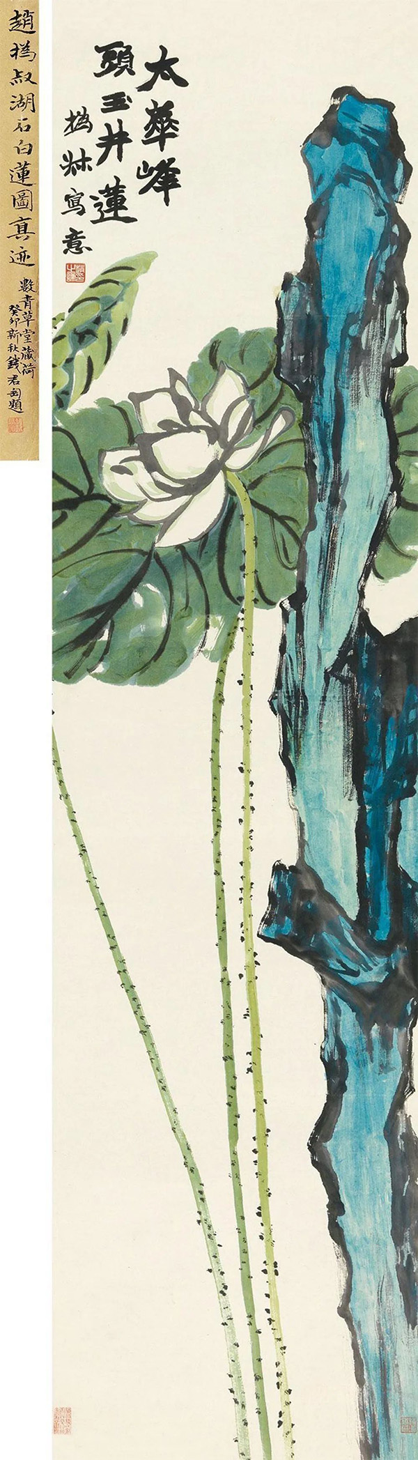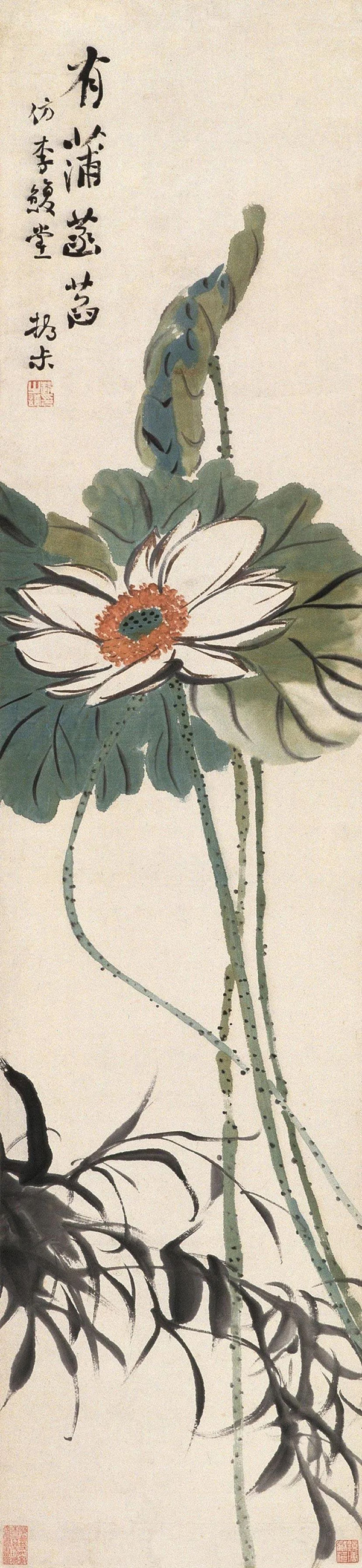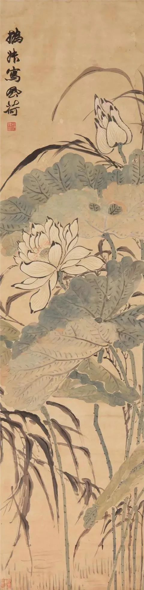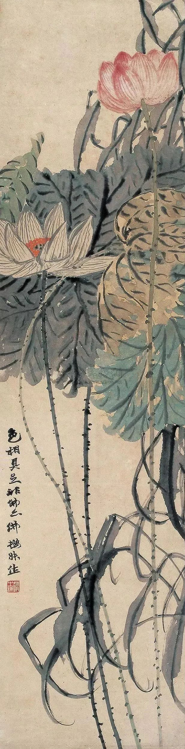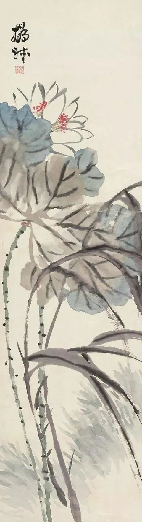 此幅作品采取了極為夸張的手法,取立幅,豎繪荷莖,挺拔向上,從紙底直至紙頂,上端著兩朵荷花,相互呼應,婷婷俊秀。