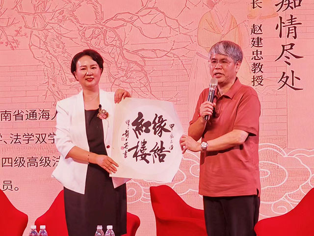 趙建忠教授贈(zèng)天津著名書法家趙士英書法“緣結(jié)紅樓”給楊勤。郁龍余教授現(xiàn)場(chǎng)將作家創(chuàng)作、并由深圳市簡(jiǎn)帛書法愛好者陳健書寫的“贈(zèng)山谷”詩給楊勤:玉溪出才俊,亭亭且獨(dú)立。二八寫長(zhǎng)詩,牛郎與織女。業(yè)余續(xù)紅樓,有笑也有泣。雪芹喜欲狂,夢(mèng)見榴花紀(jì)。