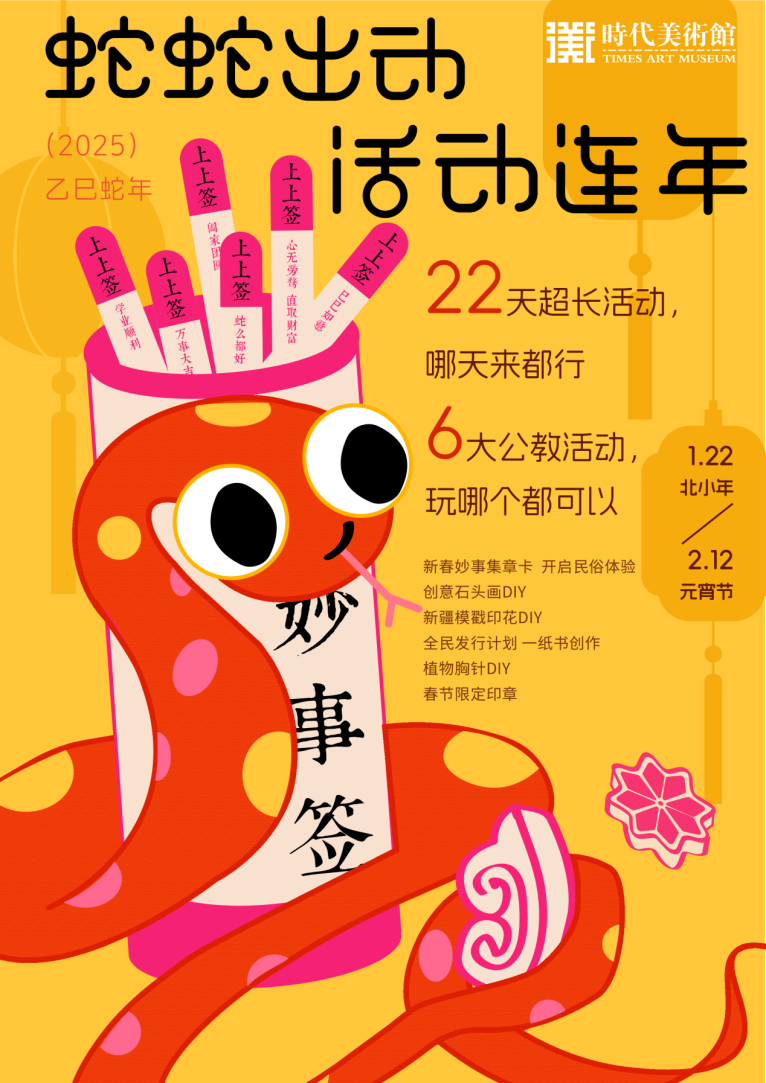 春節(jié)期間,北京時(shí)代美術(shù)館通過(guò)藝術(shù)詮釋傳統(tǒng)年俗。觀眾入館即可領(lǐng)取妙事體驗(yàn)卡,開(kāi)啟華熙國(guó)際集團(tuán)打造的民俗之旅。沿指定路線集章打卡,有機(jī)會(huì)贏取新春好禮。在許愿墻許下心愿,寄托新年期望。此外,在小紅書(shū)上@北京時(shí)代美術(shù)館,可參與抽取“好運(yùn)上上簽”,獎(jiǎng)品豐富,包括美術(shù)館限定花瓶、展覽周邊禮等,中獎(jiǎng)率百分之百?;顒?dòng)期間,蛇年限定版印章更是為很多觀眾留下了獨(dú)特的新年記憶。
