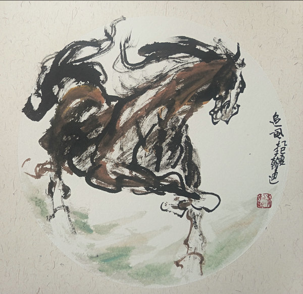 2. 造型表現(xiàn):對馬的造型進(jìn)行了藝術(shù)化處理,并非追求寫實(shí)的精準(zhǔn),而是注重抓住馬奔跑時的動態(tài)神韻。以簡潔而夸張的線條,表現(xiàn)出馬的肌肉、骨骼和動態(tài),雖不似西方寫實(shí)繪畫那般細(xì)膩入微,但卻能生動傳達(dá)出馬的活力與精神氣質(zhì)。比如雙馬或多馬同框的畫作,通過不同姿態(tài)展現(xiàn)馬群奔騰的氣勢。 3. 意境營造:畫面背景簡潔,留白處理巧妙,給人以廣闊想象空間,突出主體馬的同時,營造出一種自由奔放、豪邁灑脫的意境。幾幅畫中雖背景色彩簡單,但通過墨色與構(gòu)圖,能讓人感受到馬在廣袤天地間馳騁的壯闊場景。
