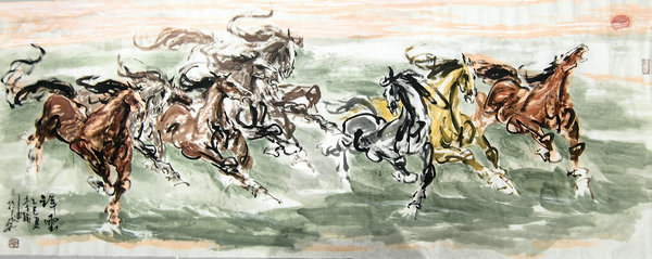 4.綜合分析:特別是這幅群馬題材的中國畫。從技法看,畫家以豪放灑脫的筆墨勾勒馬的形態(tài),運(yùn)用濃淡相宜的墨色和富有變化的線條,生動展現(xiàn)出馬的肌肉、骨骼和飄逸的鬃毛,體現(xiàn)了中國傳統(tǒng)水墨畫注重神韻和寫意的特點(diǎn)。從構(gòu)圖而言,群馬呈奔跑之勢分布畫面,營造出一種動態(tài)的節(jié)奏感,仿佛能讓人感受到馬蹄奔騰的力量和呼嘯的風(fēng)聲,布局疏密得當(dāng),既展現(xiàn)出馬群的氣勢,又有個體姿態(tài)的細(xì)節(jié)呈現(xiàn)。從意境來講,群馬奔騰的畫面?zhèn)鬟f出積極向上、勇往直前的精神力量,給觀者帶來強(qiáng)烈的視覺沖擊和精神鼓舞,契合人們對力量、速度和自由的向往 。整體上,這幅畫是傳統(tǒng)技法與精神內(nèi)涵的良好融合,具有較高的藝術(shù)價值。