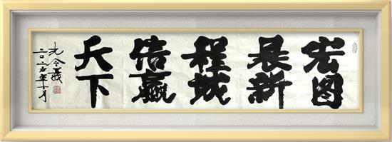 這種創(chuàng)新書(shū)體并非簡(jiǎn)單的形式變革,而是基于對(duì)書(shū)法史演變的深刻研究和洞察,正如中國(guó)歷史上每個(gè)鼎盛時(shí)代都會(huì)孕育新的書(shū)體,孔令義的新行楷體書(shū)法突出字體上的四角飽滿,正大方正,昂首挺立。筆劃上又采用隸書(shū)、楷體、行書(shū)筆劃優(yōu)長(zhǎng),走筆自如瀟灑,克服古法用筆的呆板,筆法雄健有力,以入木三分之功體現(xiàn)新時(shí)代氣質(zhì),是對(duì)當(dāng)代中國(guó)精神風(fēng)貌的藝術(shù)凝練。