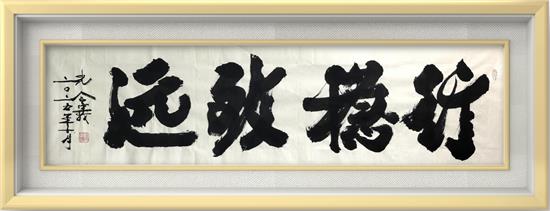 這種對(duì)漢字本真的守護(hù),源于他對(duì)書(shū)法與傳統(tǒng)文化的深刻認(rèn)知,深信只有書(shū)法才是文化的忠實(shí)記錄者,而新行楷體正是以筆墨續(xù)寫(xiě)了中華文明的新篇章。其作品中諸如《踔厲奮發(fā) 勇毅前行 守正創(chuàng)新 行穩(wěn)致遠(yuǎn)》、《上善若水 厚德載物 清廉守正 行穩(wěn)致遠(yuǎn)》、《勇毅前行》、《勇往直前》、《行穩(wěn)致遠(yuǎn)》《篤行致遠(yuǎn)》、《福蘊(yùn)華堂》、《百福具臻》等作品既延續(xù)了傳統(tǒng)書(shū)法的筋骨神韻,通過(guò)墨色濃淡與線條剛?cè)岬膶?duì)比,傳遞出新時(shí)代的強(qiáng)大力量和文化自信,履行著新時(shí)代書(shū)法家應(yīng)為時(shí)代而作為時(shí)代而歌的藝術(shù)擔(dān)當(dāng)。