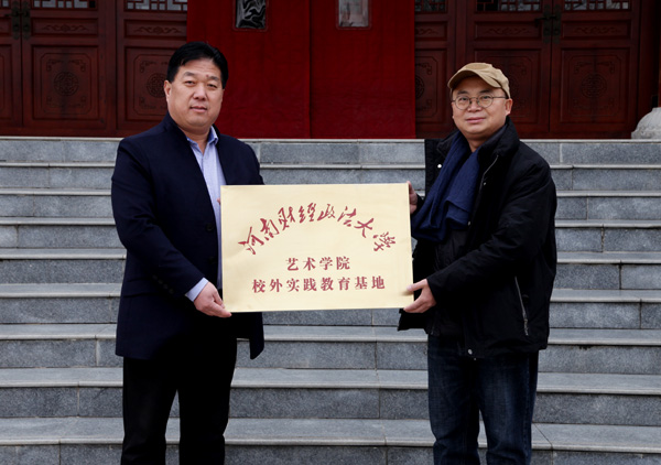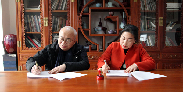 河南財經(jīng)政法大學(xué)藝術(shù)學(xué)院院長陳文利與河南盛平鈞窯總經(jīng)理楊曉平簽署合作協(xié)議