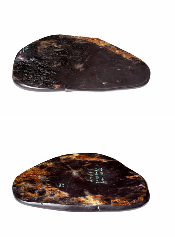 此長征主題硯雕刻的二十二方硯臺,材質(zhì)均選用源自廣東肇慶西江流域的老坑端石,選材堅(jiān)潤華美之上乘,硯堂設(shè)計(jì)與主題構(gòu)圖之巧妙,硯雕刻畫工藝手法之精湛,紅色意蘊(yùn)與筆墨造境之審美,實(shí)為首開中國工藝美術(shù)界歷史之先河。黎鏗、楊焯忠兩位制硯大師均擅長硯藝的山水造境,在創(chuàng)作長征主題硯雕刻藝術(shù)的合作上做到了珠聯(lián)璧合,因材施藝,求同存異,相得益彰。從雕刻技藝的表現(xiàn)手法上便可感知到兩代藝術(shù)大師間技藝傳承與文脈相通。