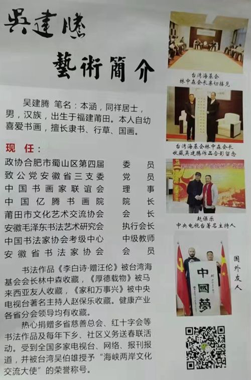 吳建騰,現(xiàn)為中國(guó)億騰書畫院院長(zhǎng)、中國(guó)書法家協(xié)會(huì)中級(jí)教師、莆田市文化藝術(shù)交流協(xié)會(huì)會(huì)長(zhǎng)、安徽省書法家協(xié)會(huì)會(huì)員,熱衷文化交流推廣與慈善公益事業(yè)。