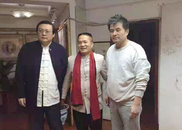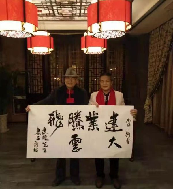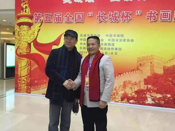 吳建騰會(huì)長(zhǎng)(右)與書畫界朋友交流合影