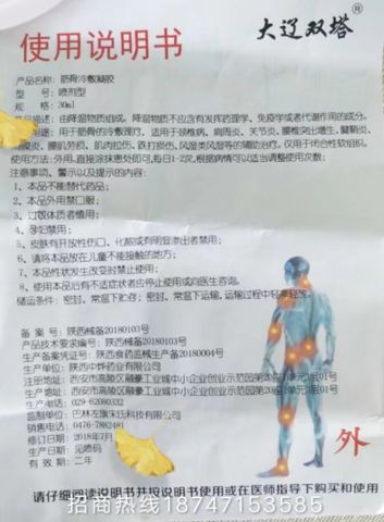 據(jù)悉,“筋骨冷敷凝膠”的主要成分,有三七、川烏、草烏、蜂毒、冰片、天麻、酒精、花椒等;適用范圍為跌打損傷、消腫止痛、消炎撤火、風濕類風濕關節(jié)炎、頸椎病,腰間盤突出、肩周炎,骨刺,各種腰疼腿痛,風疹,濕疹,各種皮炎,各種腳氣等;使用方法:外用,噴于洗凈的患處,每日三次,癥狀消失后繼續(xù)使用本品七天,以防復發(fā),形成骨刺者噴于患處二分鐘后,按摩五分鐘。