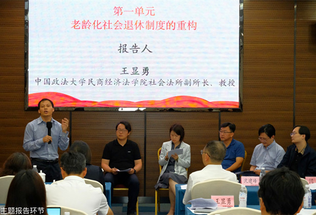本次論壇分為開幕式、主題報(bào)告與閉幕式三個(gè)環(huán)節(jié)。主題報(bào)告環(huán)節(jié)共設(shè)四個(gè)單元。第一單元由《保險(xiǎn)研究》編輯、中國保險(xiǎn)學(xué)會副研究員孟慧新主持。中國政法大學(xué)民商經(jīng)濟(jì)法學(xué)院社會法所副所長、教授王顯勇作“老齡化社會退休制度的重構(gòu)”主題報(bào)告。四川省社會科學(xué)院法學(xué)研究所所長、研究員鄭文睿,西南政法大學(xué)經(jīng)濟(jì)法學(xué)院副教授熊暉,《政治與法律》編輯、上海社會科學(xué)院法學(xué)研究所副研究員江鍇,西南政法大學(xué)經(jīng)濟(jì)法學(xué)院副教授戰(zhàn)東升,北京大學(xué)法學(xué)院博士后王也擔(dān)任評議人。
