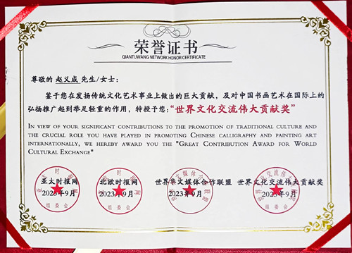 當代顏體書法名家趙義成榮獲世界文化交流偉大貢獻獎