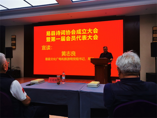 易縣文化廣電和旅游局局長黃志良宣讀《易縣文化廣電和旅游局關(guān)于同意易縣詩詞協(xié)會成立登記并作為其業(yè)務(wù)主管單位的函》。