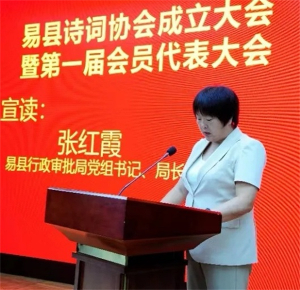 易縣行政審批局局長張紅霞宣讀《關(guān)于準予成立易縣詩詞協(xié)會成立的決定書》。