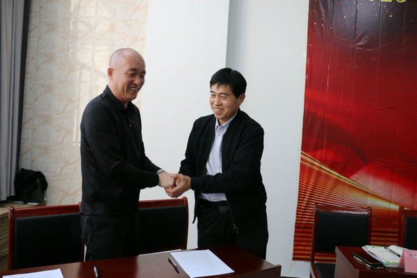 楊海卿(左)作發(fā)行動(dòng)員講話并與各工作站簽定任務(wù)書。