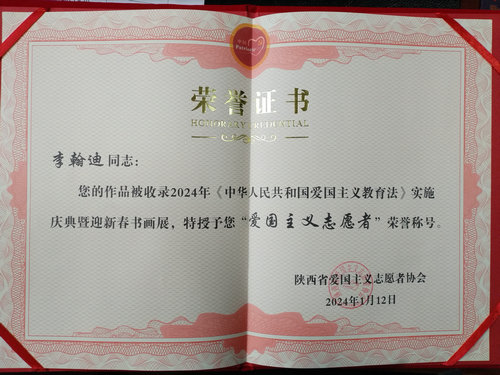 詩人畫家李翰迪榮獲“愛國主義志愿者”稱號