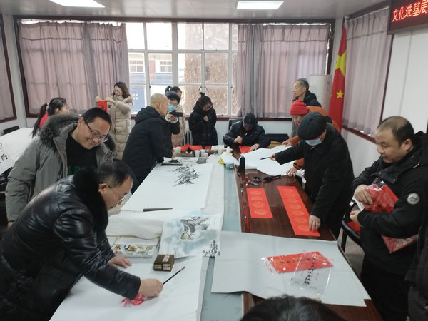 來自咸陽的書畫家孟紀青、任山源、馮世平、鄭海和李翰迪為機關干部職工現(xiàn)場進行了書畫創(chuàng)作,并書寫了數(shù)十幅春聯(lián),喜迎龍年到來。