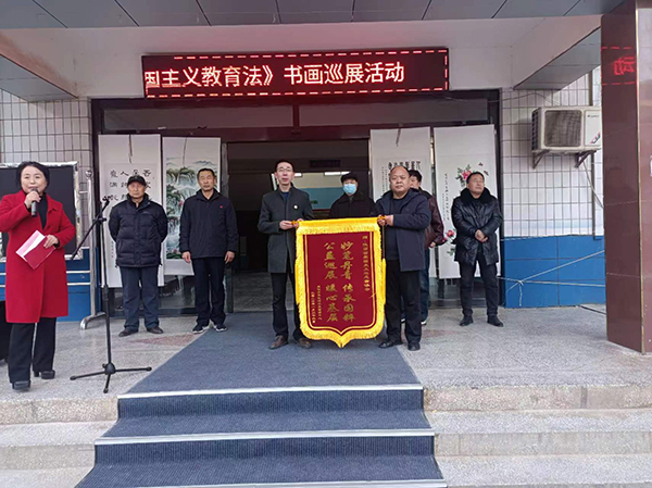 接著,咸陽市羊毛灣水庫管理中心副主任晁軒代表單位向協(xié)會贈送了寫有“妙筆丹青傳承國粹 公益巡展暖心基層”的錦旗,以示感謝。副會長鄭偉亭代表協(xié)會接受錦旗。