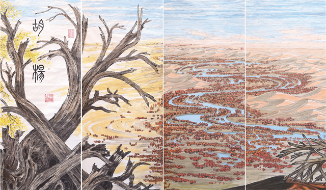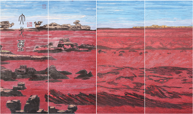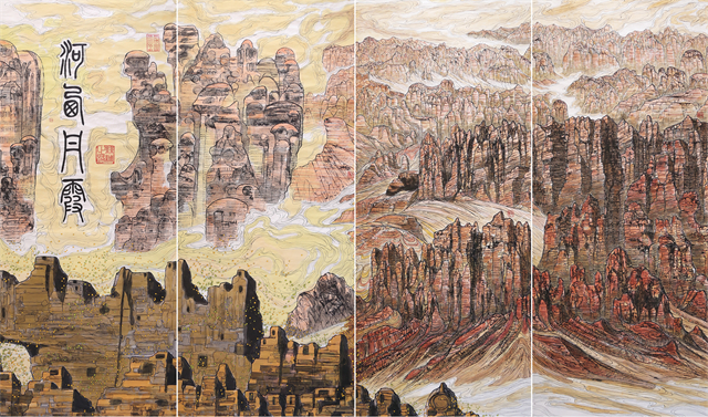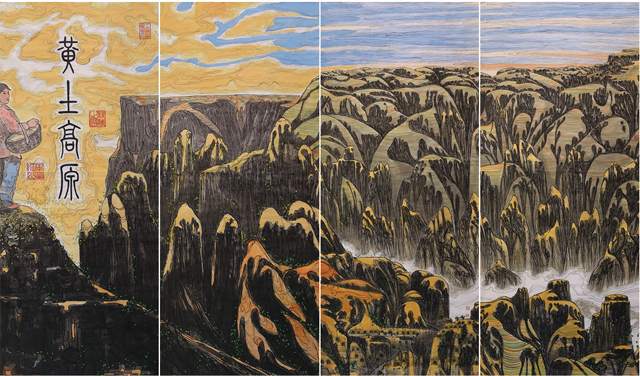 我們順著絲綢之路走到黃土高原面前,我們看到的是世界上最大的黃土塬景觀,塬的四周是神雕鬼塑的溝壑、梁岇和崾峴,巨大的塬猶如起伏的黃河波濤拱托著。數(shù)以千萬計(jì)的支溝在頻繁的洪水沖刷下不斷地蠶蝕黃土塬,各溝頭像無數(shù)魔爪伸向黃土塬。黃土塬卻像母親那樣敞開胸懷把自己身上最豐腴的肉一塊一塊地割下來,順著洪水流送到中原大地,輸送進(jìn)大海,建造起一片又一片孕育中華文化的沃土,自己則留下了溝壑縱橫、千瘡百孔的軀體。我們在畫前深深感悟到,這,就是母親的大地胸懷,是萬古傳唱的中華精神。