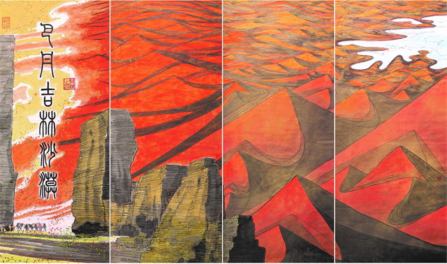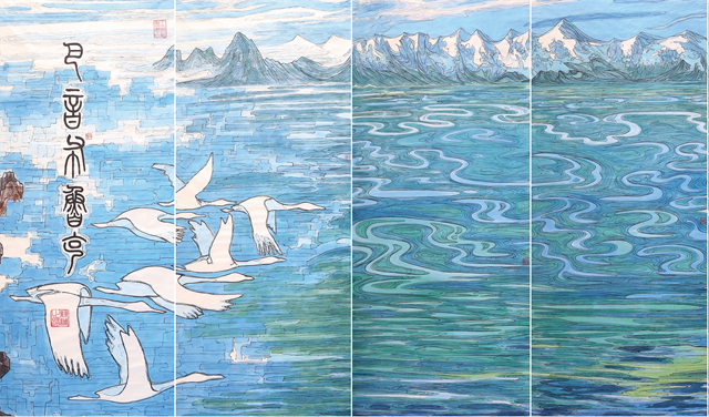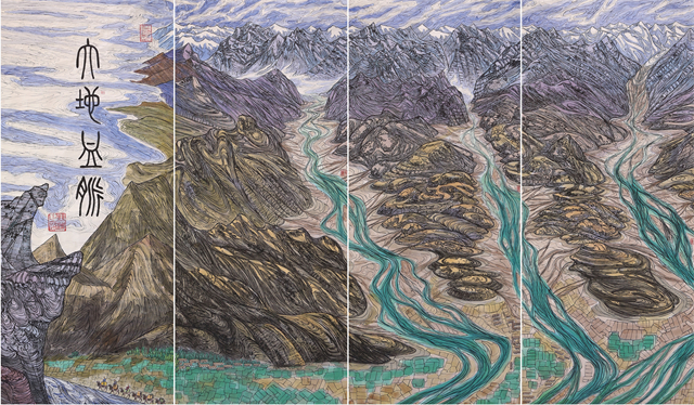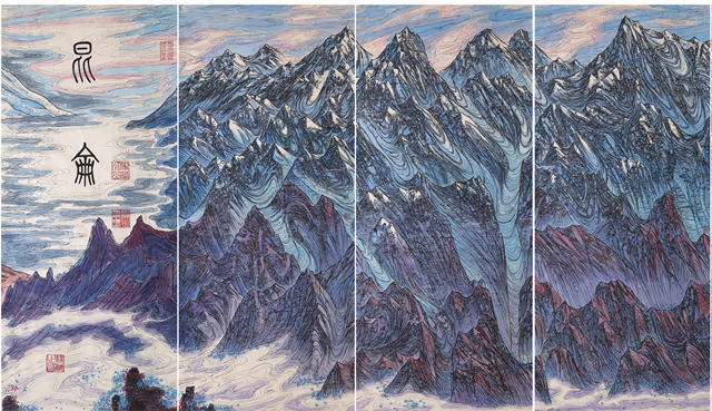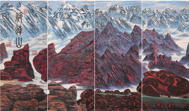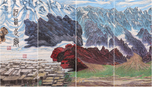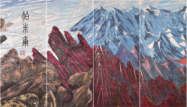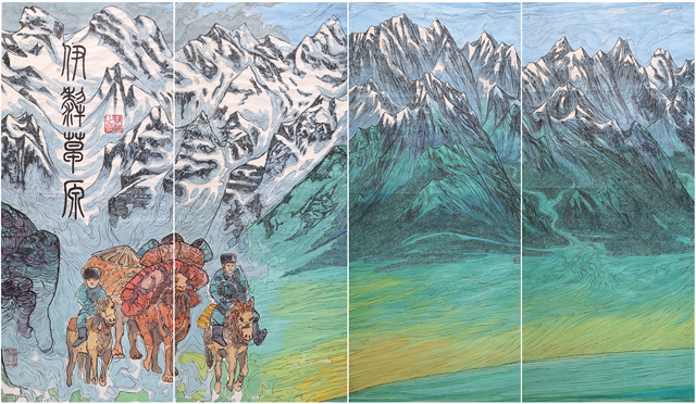 我們的視線越過世界屋脊,看到的是波瀾壯闊、五彩斑斕、氣勢磅礴的絲綢之路那震撼人心的景觀。我們首先看到的是古絲綢之路上最為艱險(xiǎn)和神秘的帕米爾高原,接著是最偉大的山脈昆侖山。古往今來的人們稱為“萬山之祖”、“中華龍脈”、“萬神之鄉(xiāng)”的昆侖確實(shí)成為“亞洲脊柱”。“赫赫我祖”來自昆侖,中華民族的文化史上昆侖具有顯赫地位,正因如此作者用長達(dá)四十多米篇幅創(chuàng)作出地動(dòng)山搖的昆侖山的氣勢,讓我們無法克制從內(nèi)心發(fā)出驚嘆!敬畏!