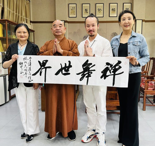 能修法師提筆揮灑寫下墨寶《禪舞世界》贈(zèng)送李偉淳老師。