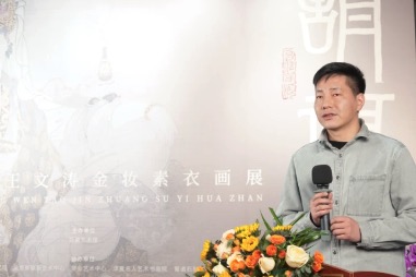 王文濤畢業(yè)于西安美術(shù)學(xué)院國畫系,“金妝素衣”系列作品的創(chuàng)作源于在他在西安美術(shù)學(xué)院就讀期間的敦煌之旅。“在創(chuàng)作過程中,我常常會(huì)想起敦煌壁畫中的那些精彩畫面,從中汲取創(chuàng)作的靈感和力量。我希望能夠?qū)⒍鼗捅诋嫷乃囆g(shù)精髓吸收融入到自己的作品中,去追尋古人的藝術(shù)密碼,在筆下煥發(fā)新的面貌。”王文濤表示。