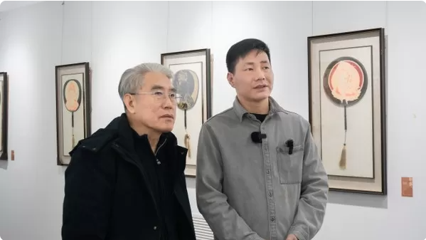王文濤(右)在展覽現(xiàn)場(chǎng)與中華詩詞協(xié)會(huì)詩教部副主任李建春交流