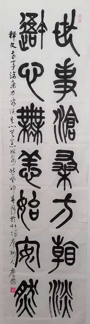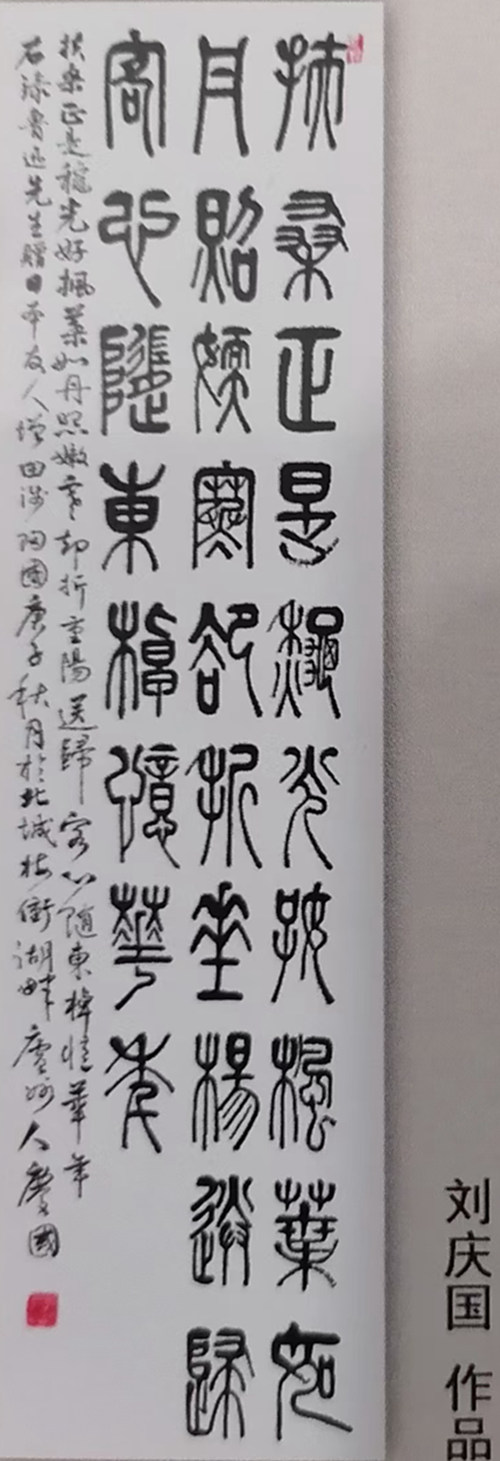 劉慶國的書法藝術廣受好評,尤其是他的篆書和隸書,沉穩(wěn)有力,就如秋日里沉靜的湖面。他大半生的教育生涯,為他增加了豐厚的文化底蘊,也助他的書風含蓄內斂,一筆一劃,張弛有度,就像一位儒雅的老先生,灑脫俊秀,又謙遜低調。他堪稱為合肥地區(qū)代表性的書法家,待時日,終被世人發(fā)現(xiàn)贊賞!