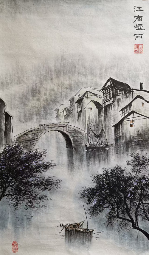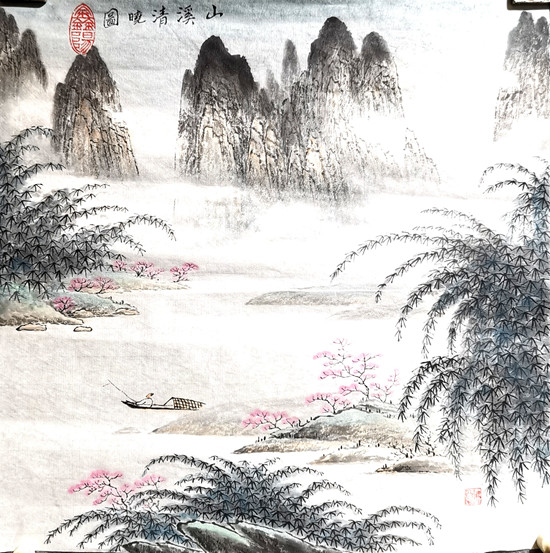 今天,他與我對面而坐,他的面容帶著一絲絲微笑。等看到他文氣十足的南派山水,才覺他的外表背叛了他的心。他筆下的山水小品,清秀素雅,偶飾顏色。幾幅金陵畫派風格的寫意山水都出自他的妙筆之下,又汲取了海派小寫意技法,脫俗清新,賞心悅目。