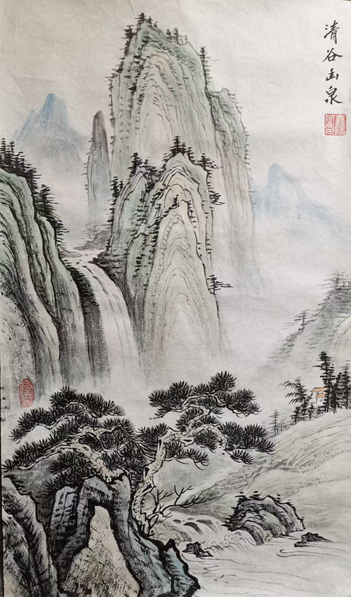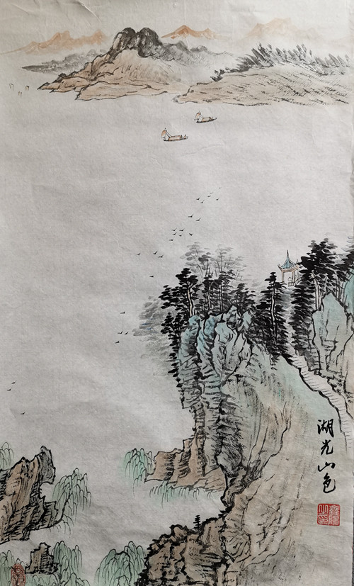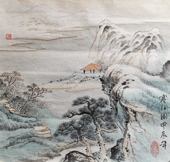 在一個寒冷的午后,一位老友帶他來喝茶,一杯溫香的普洱茶入口,他講起少時學畫的歷程,既興奮,又有一絲絲的心酸。他家學豐厚,早年有機會接觸錢松巖、宋文治、亞明等當代金陵畫派名家作品,日賞夜摹,打下厚實的國畫功底。成年后,他光榮地加入了東海艦隊,四年的軍旅生涯鍛煉了他的身心。回到家鄉(xiāng)后,在人生的道路上他選擇了音樂,寫歌詞,登臺演唱,為他和他的家庭帶來了富足的物質財富。然而,他始終沒有放棄國畫,那是他難以割舍的夢。每每夢回,都是他苦苦追尋國畫之美的時刻,無論演出多累,時間多晚,他都擠出時間來畫幾筆,在二三十年里,無論春秋與寒暑,他都無怨無悔,癡迷其間。