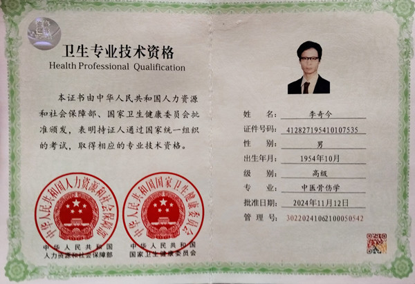 2024年11月12日,又通過國家統(tǒng)一組織的考試,考取得了高級中醫(yī)骨傷專業(yè)資格證書,得到省有關領導的表彰鼓勵!為我市縣爭得了榮譽。