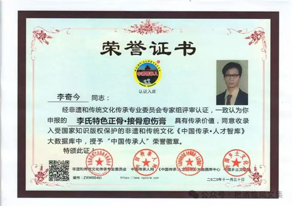 4.李氏接骨愈傷膏,獲得駐馬店市科技成果二等獎后,又得到河南省自然科學獎、中國傳統(tǒng)醫(yī)學優(yōu)秀成果獎、獲聯(lián)合國頒發(fā)的(T丨PS)技術信息促進系統(tǒng)中國國家分部“發(fā)明創(chuàng)新科技之星”獎 。 2024年12月3日,李奇今先生向國家知識產權局申報的《李氏傳承膏》商標注冊,得到備案批準,并在河南康時達藥業(yè)有限公司生產制作,推廣倡用,為因經絡不通、勞損、跌打損傷引起的骨關節(jié)疼痛的亞健康人群,做出了解除痛苦的出色貢獻!其業(yè)績已經入錄2024年《中國藥谷之力(中醫(yī)藥卷)》辭書中。