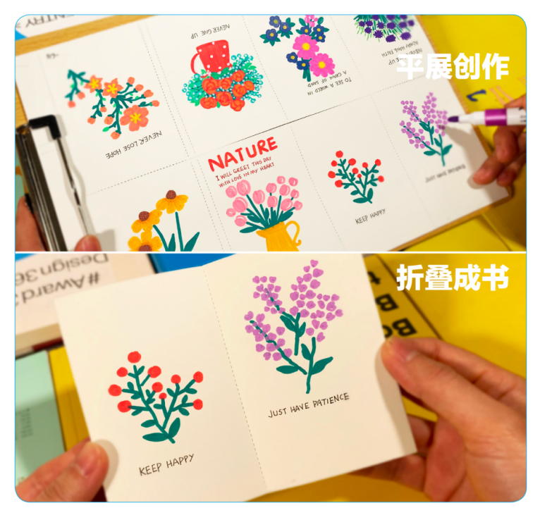在展覽之外,美術(shù)館還準(zhǔn)備了豐富的公教活動(dòng)。購買《能量宇宙》或雙展門票,可參與“新疆模戳印花”活動(dòng),體驗(yàn)新疆非遺文化。還能親手DIY植物胸針,了解植物奧秘,制作獨(dú)一無二的飾品;有著作家夢(mèng)的觀眾,購買《計(jì)深遠(yuǎn)——為兒童而設(shè)計(jì)》或雙展門票,能獲得手繪書材料,制作并“出版”專屬手繪小書,鐫刻才華。