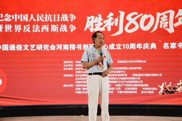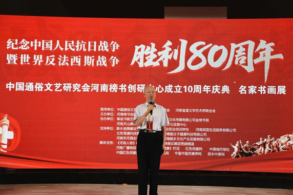 中國通俗文藝研究會榜書委員會副會長,河南榜書創(chuàng)研中心主任李存立先生致辭,首先向各位領(lǐng)導(dǎo)、嘉賓以及藝術(shù)家們的到來表示親切的問候真摯的感謝,重點(diǎn)闡述了這次舉辦紀(jì)念抗日戰(zhàn)爭暨世界反法西斯戰(zhàn)爭勝利80周年的重大意義,回顧了河南榜書創(chuàng)研中心十年來的發(fā)展歷程,始終堅(jiān)持以人民為中心的創(chuàng)作導(dǎo)向,致力于傳承和弘揚(yáng)中華優(yōu)秀傳統(tǒng)文化,在推動榜書藝術(shù)發(fā)展和公益事業(yè)方面做出的重大貢獻(xiàn)。